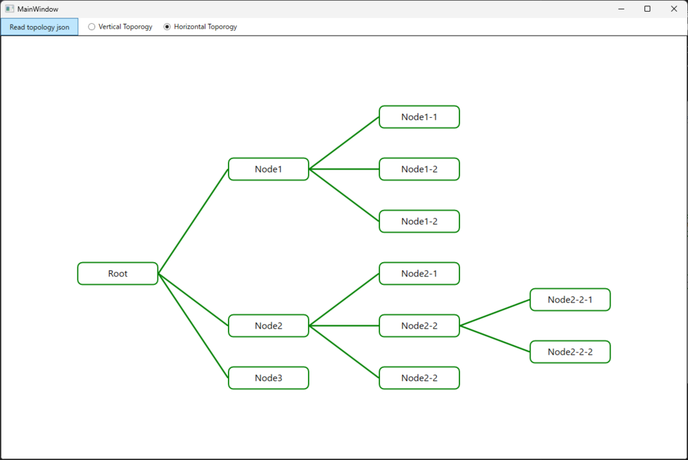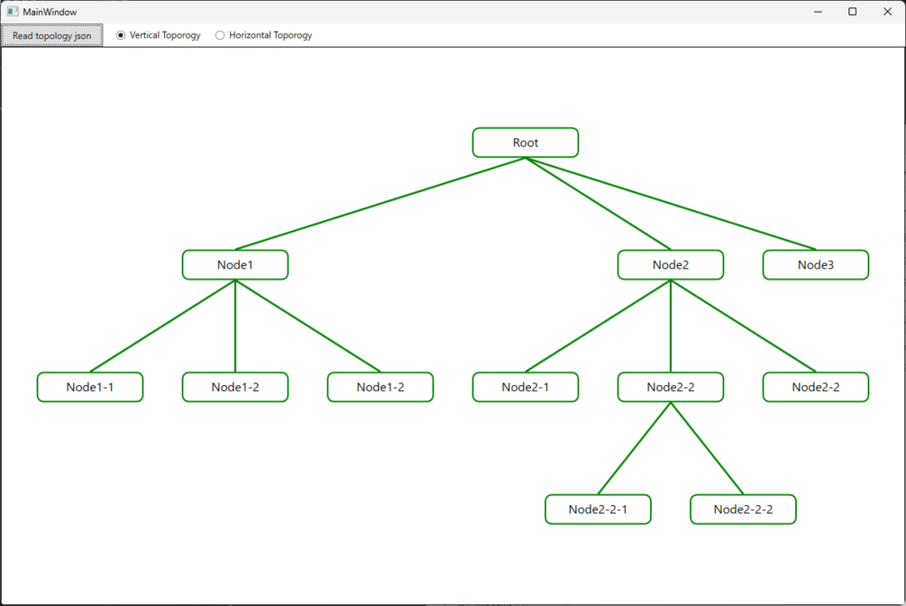 This is an application for topology drawing of tree-structured data in WPF. It reads “data.json” directly under the executable file and draws the topology. The topology can be drawn vertically or horizontally.
